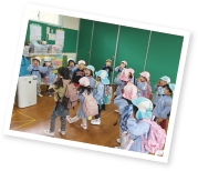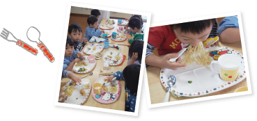 幼稚園内の給食施設で作られた、バランスの摂れた給食をお友だちと楽しく食べます。メニューには旬の食材や、季節のメニューが取り入れられています。
