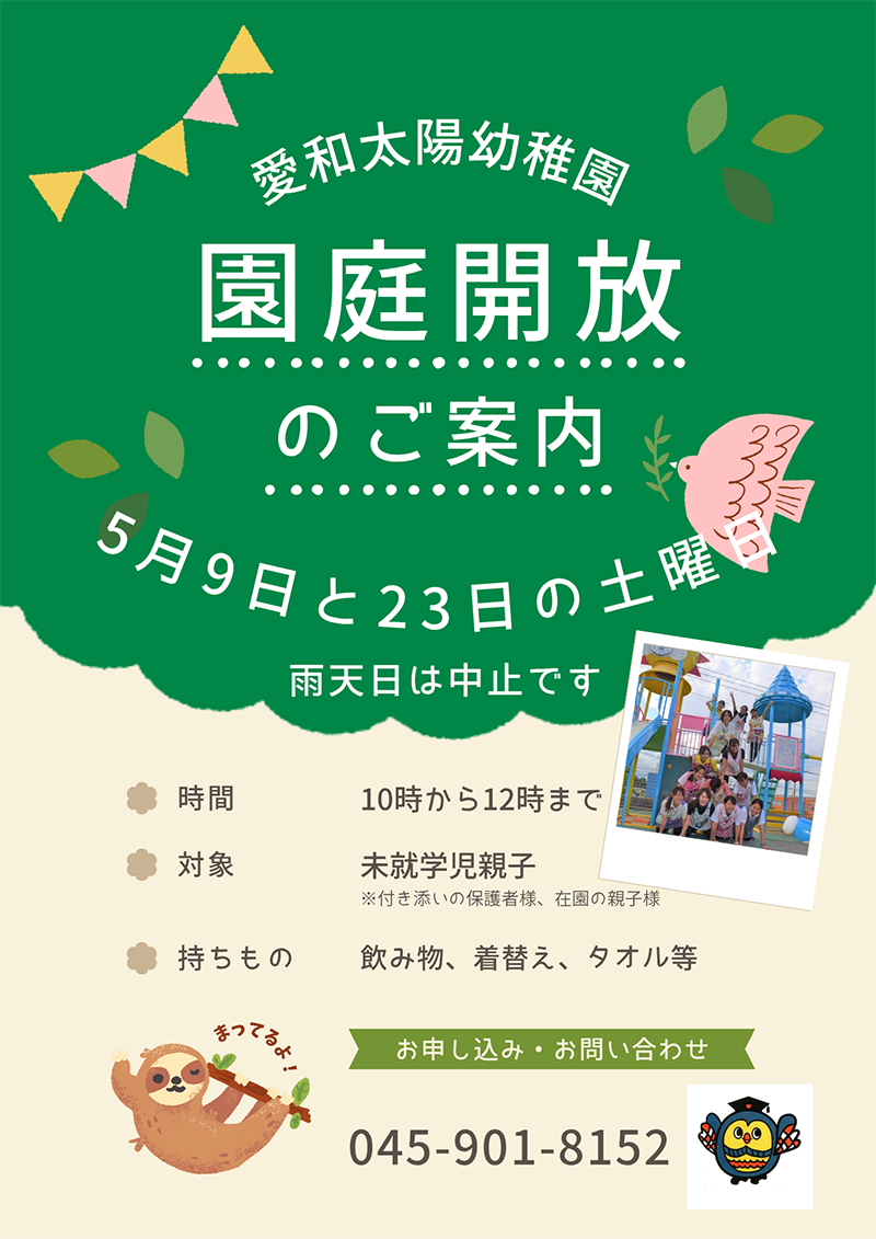 | 10時30分~15時 ※園庭開放日は、小さな図書室も開放致します。(園庭開放の時間内) |